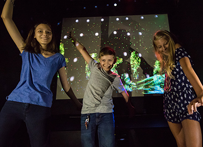 Light & Sound ZoneGet ready to dance like no one is watching! As you walk in front of this screen, watch as your shadow quickly multiplies into different colors and patterns! Do you hear the music? Bust a few of your best moves in front of the screen and watch as every movement of your body is mirrored and multiplied in brilliant, vibrant colors.